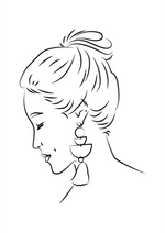 Ein schwarz-weißes Gemälde mit dem Gesicht einer Frau, deren Haare zu einem Pferdeschwanz gebunden sind und die Ohrringe trägt.