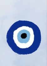 Abstraktes Gemälde mit einem augenähnlichen Design aus konzentrischen Kreisen in Blau- und Schwarztönen auf hellblauem Hintergrund.
