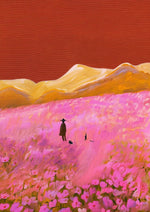 Eine rosa Blumenwiese mit einer Figur und Haustieren unter einem warmen orangefarbenen Himmel und gelben Hügeln.