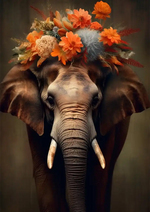 Dieses Gemälde zeigt einen Elefanten mit großen Stoßzähnen und einer Krone aus lebendigen orangefarbenen und beigen Blumen auf seinem Kopf vor einem dunklen Hintergrund.