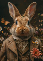 Auf diesem Gemälde sehen Sie eine digital illustrierte Abbildung eines Kaninchens, gekleidet in einen Vintage-Stil-Anzug, komplett mit einer Fliege. Das Kaninchen steht aufrecht, umgeben von Blumen und Schmetterlingen, mit einem detaillierten Fell und ausdrucksvollen Augen.