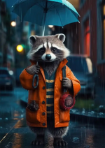 Dieses Gemälde zeigt einen Waschbären aufrecht stehend in einer regnerischen Straße mit einem orangefarbenen Regenmantel und einem gestreiften Hemd. Der Hintergrund zeigt eine Stadtstraße mit verschwommenen Bauleuchten, die eine skurrile Abendstimmung erzeugen.