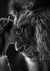 Dieses Gemälde zeigt ein Schwarz-Weiß-Bild einer Frau, die sanft die Stirn eines großen Löwen berührt, wobei ihre geschlossenen Augen einen ruhigen, intimen Moment der Verbundenheit zeigen.