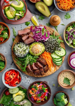 Dieses Gemälde zeigt ein Charcuterie-Board mit verschiedenen Gemüsesorten, geschnittenem Rindfleisch, Avocado, lila Kohl, Gurke, Karotten und Rucola vor einem dunklen Hintergrund.
