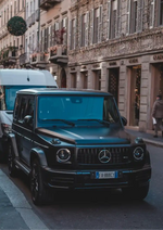 Dieses Gemälde zeigt einen schwarzen Mercedes G-Klasse, der in einer luxuriösen Straße vor einem exklusiven Modegeschäft geparkt ist.
