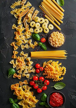Dieses Gemälde zeigt eine Auswahl an Pastasorten, darunter Schleifen, Röhren, Spiralen und Spaghetti, begleitet von Kirschtomaten, Basilikumblättern und Knoblauch auf einem dunklen Hintergrund.