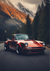 Dieses Gemälde zeigt einen Porsche 911 Turbo, der auf einer Straße mit einer bergigen Landschaft im Hintergrund geparkt ist. Das Auto hat runde Scheinwerfer und ein schlankes, auffälliges Design.