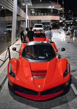 Dieses Gemälde zeigt einen roten La Ferrari, der nachts in einer Stadtstraße geparkt ist, mit Fußgängern in der Nähe und anderen Autos, die im Hintergrund geparkt sind. Die Szenerie zeichnet sich durch moderne Architektur mit beleuchteten Akzenten aus.