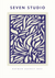 Ein Gemälde mit darüber Seven Studio und vielen blauen Elementen auf beigem Hintergrund.