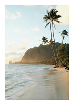 Een zandstrand met zachte golven, aan de rechterkant begrensd door hoge, slanke palmbomen. Op de achtergrond is er een bergachtig landschap met zacht, goudkleurig licht dat het tafereel verlicht. De lucht is overwegend helder met wat verspreide wolken, waardoor het perfect is om vast te leggen in een Sunny Beach Schilderij van CollageDepot om op te hangen als je volgende wanddecoratie.-