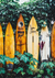 Ein Gemälde mit einer Wand voller Blätter, an der mehrere Surfbretter lehnen.