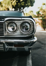 Dieses Gemälde zeigt eine Nahaufnahme der Vorderseite eines amerikanischen Autos, mit dem detaillierten Kühlergrill und den doppelten runden Scheinwerfern, aufgenommen an einem sonnigen Tag mit unscharfem Grün im Hintergrund.