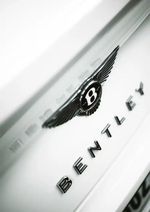 Dieses Gemälde zeigt eine Nahaufnahme des Logos auf der Rückseite eines weißen Bentley.