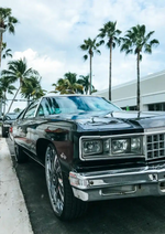 Dieses Gemälde zeigt einen glänzend schwarzen Chevy Caprice mit großen Chromrädern, der unter wehenden Palmen vor einem klaren Himmel geparkt ist.