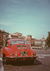 Dieses Gemälde zeigt einen roten Porsche 356, der auf einem Platz in einer europäischen Stadt geparkt ist, mit klassischen Gebäuden unter einem klaren Himmel.