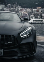 Dieses Gemälde zeigt einen mattschwarzen Mercedes AMG GTR, der am Wasserufer in Monaco geparkt ist. Das Auto verfügt über klare Linien und moderne Designelemente.