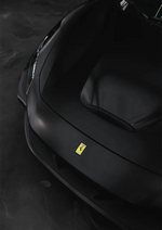 Dieses Gemälde zeigt eine Draufsicht auf die Motorhaube eines matt schwarzen Ferrari F8 Tributo mit einem auffälligen gelb-schwarzen Emblem in der Mitte. Das schlanke Design des Autos wird vor einem dunklen Hintergrund hervorgehoben.