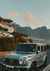 Dieses Gemälde zeigt einen silbernen Mercedes G-Klasse, der auf einer Straße neben moderner Architektur geparkt ist, mit einem Berg im Hintergrund unter einem klaren Himmel bei Sonnenuntergang.