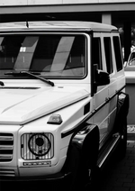 Dieses Gemälde zeigt ein Schwarzweißfoto eines weißen Mercedes G-Wagens, der auf der Straße geparkt ist, mit markantem Kühlergrill und Scheinwerfern. Das Bild ist auf die Vorderseite des Fahrzeugs ausgerichtet.
