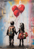 Dieses Gemälde zeigt zwei Kinder, die Hand in Hand gehen, mit einer Schnur, die an zwei roten herzförmigen Luftballons befestigt ist. Das Mädchen hält einen Blumenstrauß in der Hand.