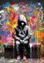 Dieses Gemälde zeigt einen Jungen, der auf einer Bank sitzt, vor einem lebendigen, vielfarbigen Graffiti-Hintergrund.