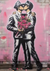 Dieses Gemälde zeigt zwei Männer im Anzug, die sich küssen, einer hält einen Strauß rosa Blumen in der Hand.