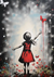 Dieses Gemälde zeigt ein Mädchen in einem roten Kleid, das nach einem Schmetterling greift, umgeben von Farbspritzern.