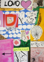 Eine Collage aus Zeichnungen, Texten und Mustern in leuchtenden Farben zeigt eine Explosion der Kreativität.