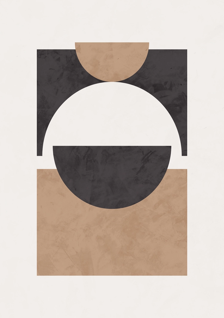 Een minimalistisch abstract schilderij met geometrische vormen in aardetinten: een groot zwart vierkant met respectievelijk een cirkel en een halve cirkel in crème en beige, gerangschikt op een gestructureerde witte achtergrond.