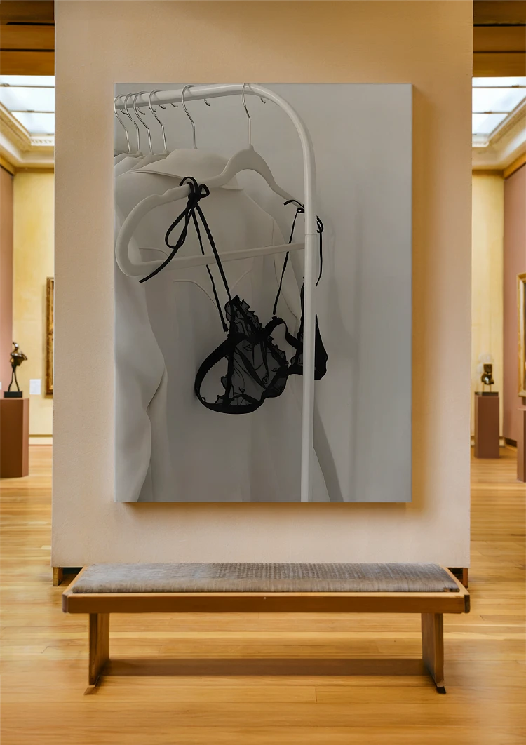 Ein Gemälde eines Kleiderständers mit weißen Kleidungsstücken und einem schwarzen BH.