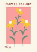 Dieses Gemälde zeigt eine Illustration von drei einfachen, stilisierten Gänseblümchen mit gelben Blütenblättern und grünen Stängeln auf einem sanften rosa Hintergrund. Eine charmante Ergänzung für jeden Raum!