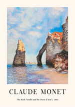 Dieses Gemälde von Claude Monet, "The Rock Needle and the Porte d'Aval" aus dem Jahr 1885, zeigt eine felsige Küstenlandschaft mit einem Bogen und einer hohen, schmalen Felsformation vor blauem Himmel und ruhigem Meer, mit Segelbooten in der Ferne.