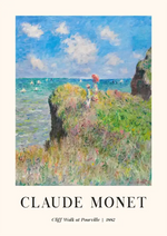 Dieses Gemälde mit dem Titel "Cliff Walk at Pourville" von Claude Monet aus dem Jahr 1882 zeigt zwei Frauen auf einer grasbewachsenen Klippe, die auf das Meer blicken, mit einem lebhaften blauen Himmel und verstreuten Wolken im Hintergrund.