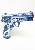 Dieses Gemälde zeigt eine Waffe mit komplizierten blauen Blumenmustern, die die Oberfläche schmücken. Das Design bedeckt die meisten Teile der Waffe und verleiht ihr so ein elegantes und markantes Aussehen vor einem weißen Hintergrund.