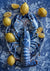 Gemälde einer blauen Hummer auf einem Musterbrett, umgeben von ganzen und halbierten gelben Zitronen. Der Hintergrund mit blau-weißem Muster erzeugt einen visuell auffälligen Kontrast.