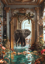 Dieses Gemälde zeigt einen Elefanten in einem reich verzierten Raum mit Marmorsäulen und einem Boden, der teilweise in Wasser getaucht ist, mit schwimmenden Blumen und goldenen Details.
