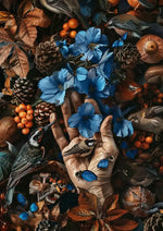 Dieses Gemälde zeigt ein detailliertes Kunstwerk einer Hand, umgeben von einer Vielzahl an Flora und Fauna. Dadurch entsteht eine wunderschöne und harmonische Szenerie.