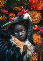Dieses Gemälde zeigt ein Kind mit tiefblauen Augen, umgeben von lebendigen Blumen in Orange, Rot und Rosa vor einem üppigen, farbenfrohen Hintergrund.