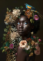 Dieses Gemälde zeigt eine Person mit dunkler Hautfarbe und hellblauen Augen, umgeben von Blumen und Grün. Neben ihr steht ein Leopard, ebenfalls mit Blüten geschmückt, während ein bunter Vogel auf ihrem Kopf sitzt, mitten im Blumenstillleben.