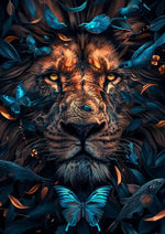 Dieses Gemälde zeigt einen majestätischen Löwen, umgeben von lebendiger Flora und Fauna, darunter blaue Schmetterlinge, Vögel und Fische. Der intensive Blick des Löwen wird mit reichen erdigen und lebendigen Blautönen kombiniert.