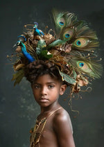 Dieses Gemälde zeigt einen Jungen mit dunkler Hautfarbe, gekleidet in eine Pfauenfederschmuck, umgeben von der Farbenpracht des Pfaus.