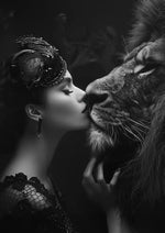 Dieses Gemälde zeigt eine Frau, gekleidet in Spitze und mit einer Kopfbedeckung mit Perlen, die liebevoll die Nase eines Löwen berührt, während ihre Hand auf seinem majestätischen Gesicht ruht. Das Bild fängt einen intimen und friedlichen Moment zwischen Mensch und Tier ein.