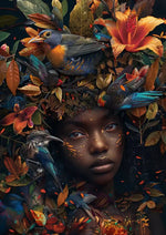 Dieses Gemälde zeigt eine Person mit dunkler Haut, umgeben von bunten Vögeln, Blättern und weißen Blumen. Der üppige Kopfschmuck, wie ein lebendiges Blumenarrangement, verschmilzt wunderschön mit dem Haar und der Umgebung der Person.