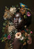 Dieses Gemälde zeigt eine Person mit dunkler Hautfarbe und hellblauen Augen, umgeben von Blumen und Grün. Neben ihr steht ein Leopard, ebenfalls mit Blüten geschmückt, während ein bunter Vogel auf ihrem Kopf sitzt, mitten im Blumenstillleben.