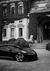 Dieses Gemälde zeigt einen elegant schwarzen Bugatti, der vor einem kunstvoll mit Grün bewachsenen historischen Gebäude mit klassischer Architektur und einem wunderschönen Eingang geparkt ist.