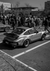 Dieses Gemälde zeigt einen vintage silbernen Porsche Carrera mit großem Heckspoiler, der während einer Autoshow auf der Straße geparkt ist, mit Gruppen von Menschen im Hintergrund.