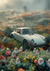 Dieses Gemälde zeigt einen vintage weißen 911, der auf einem bunten, mit Blumen gefüllten Feld geparkt ist. Die Szene ist von einem leichten Nebel umgeben, der eine verträumte Atmosphäre schafft.