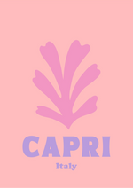 Minimalistisches grafisches Gemälde von Capri mit einem rosa Blatt vor einem zartrosa Hintergrund.