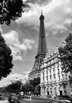 Ein Schwarz-Weiß-Gemälde des Eiffelturms, gesehen von einer Straße mit eleganten Gebäuden und Autos.