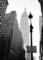 Schwarz-weißes Gemälde einer Stadtstraße, die zum Empire State Building führt, mit einer prominenten Straßenlaterne und einem Schild im Vordergrund.